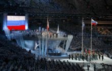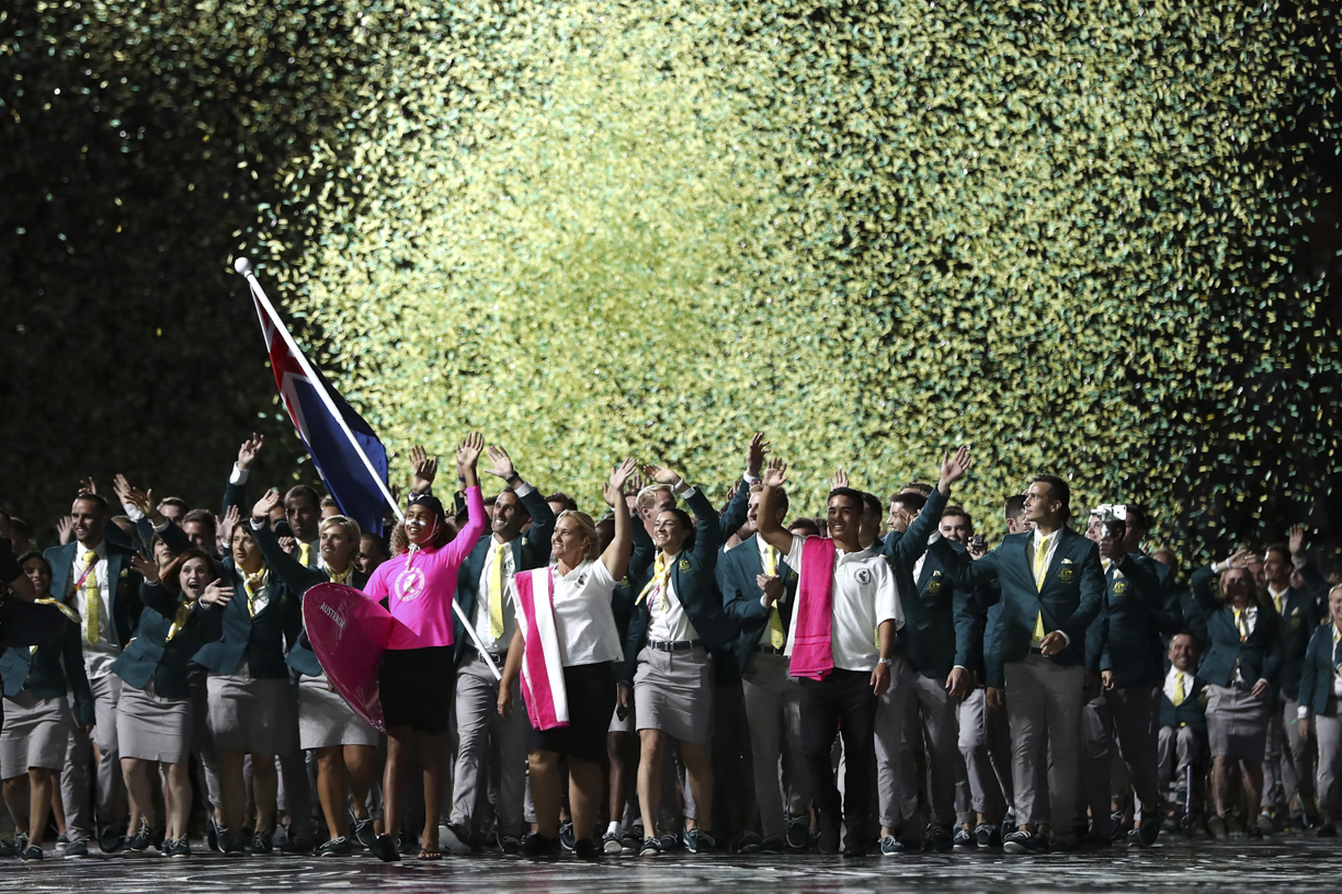 GOLD COAST, AUSTRALIA – APRIL 04: Mark Knowles, flag bearer of Australia arrives with the Australia team during the Opening Ceremony for the Gold Coast 2018 Commonwealth Games at Carrara Stadium on April 4, 2018 on the Gold Coast, Australia. (Photo by Ryan Pierse/Getty Images)