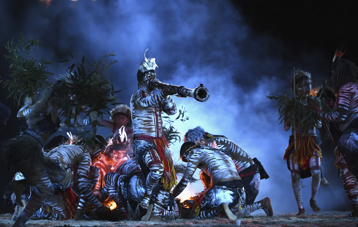 Performers take part in the opening ceremony of the 2018 Gold Coast Commonwealth Games at the Carrara Stadium on the Gold Coast on April 4, 2018. / AFP PHOTO / FRANCOIS XAVIER MARIT