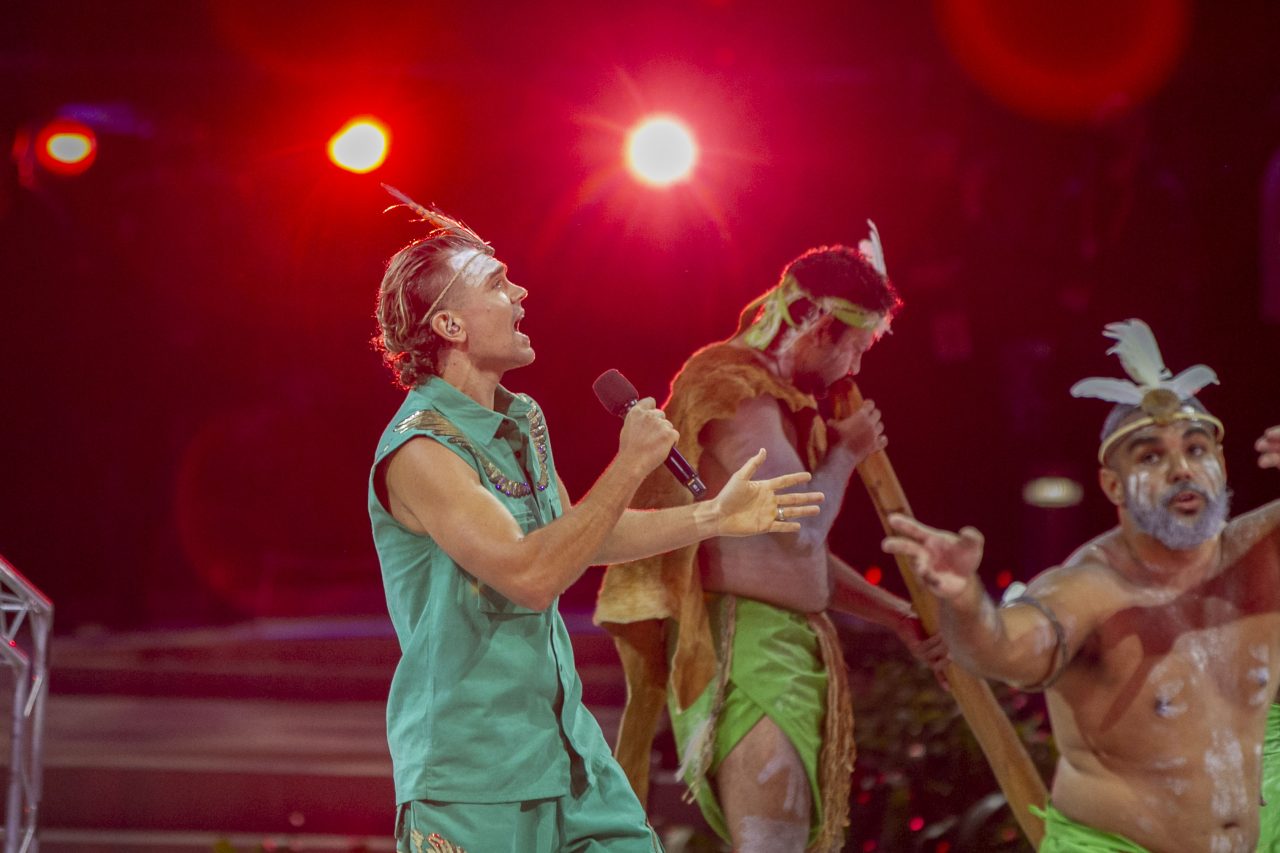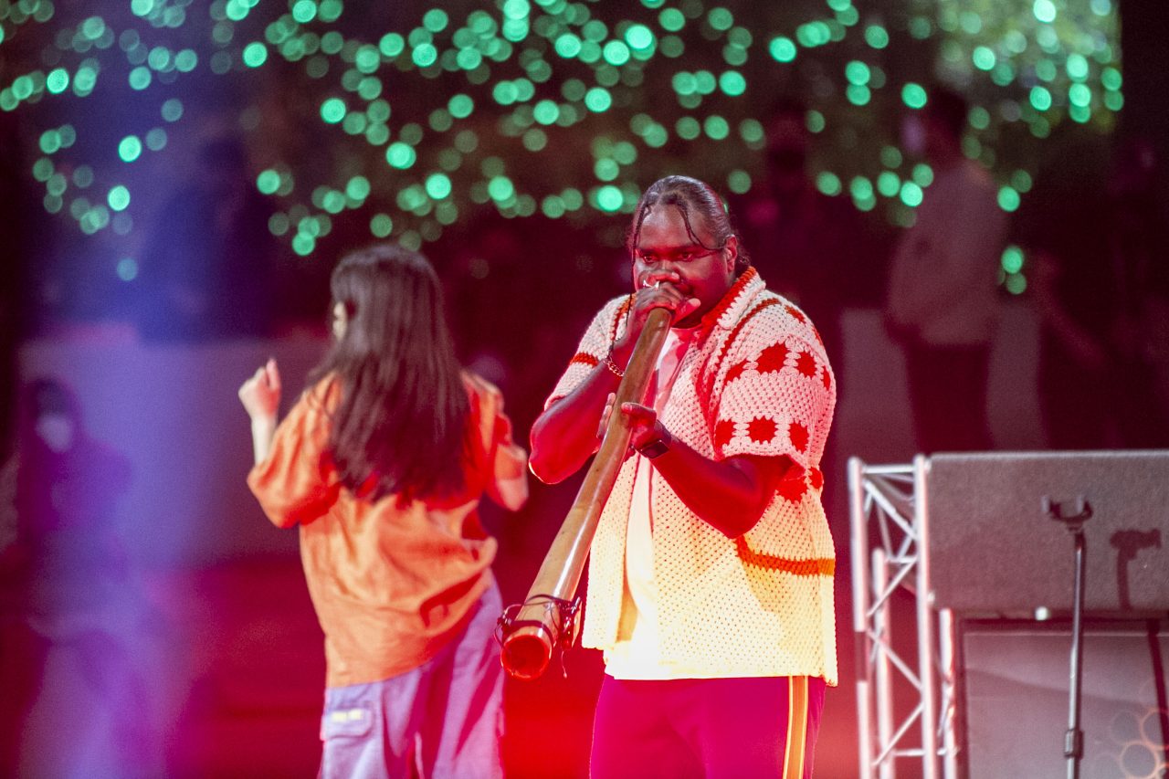 A performer takes part in the opening ceremony of the 2018 Gold Coast Commonwealth Games at the Carrara Stadium on the Gold Coast on April 4, 2018. / AFP PHOTO / Adrian DENNIS